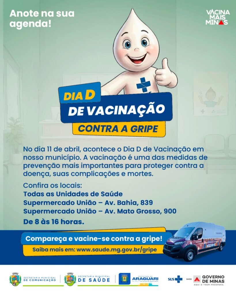 Araguari promove neste sábado (11) o Dia D de Vacinação, com aplicação de todas as vacinas, incluindo a da Influenza