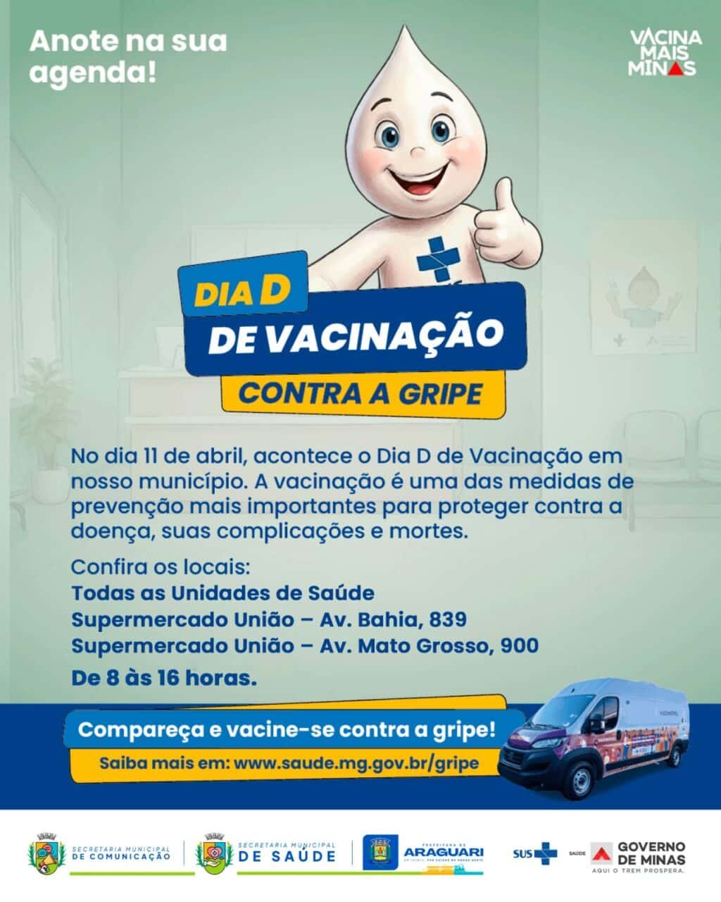 A Prefeitura de Araguari, por meio da Secretaria Municipal de Saúde, realiza neste sábado, 11 de abril, o Dia D de Vacinação, das 8h às 16h. A iniciativa acontecerá em todas as Unidades de Saúde e também em pontos estratégicos da cidade, com o objetivo de aumentar a cobertura vacinal e fortalecer a proteção da população.